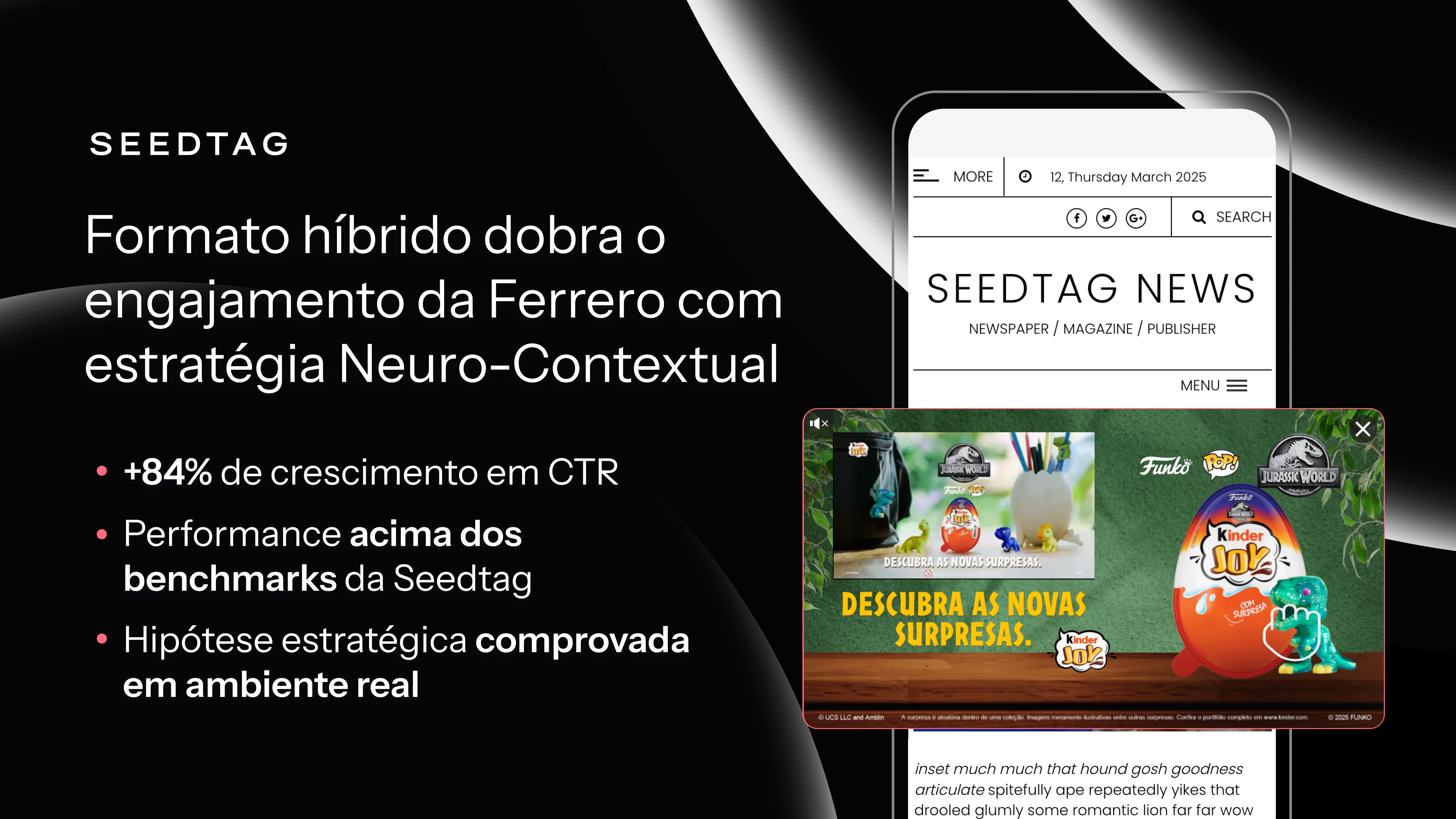 Além disso, era necessário embasar as decisões de formato com dados, já que havia uma preferência inicial por utilizar apenas o vídeo proprietário da marca, sem considerar desdobramentos criativos nos formatos Seedtag.
